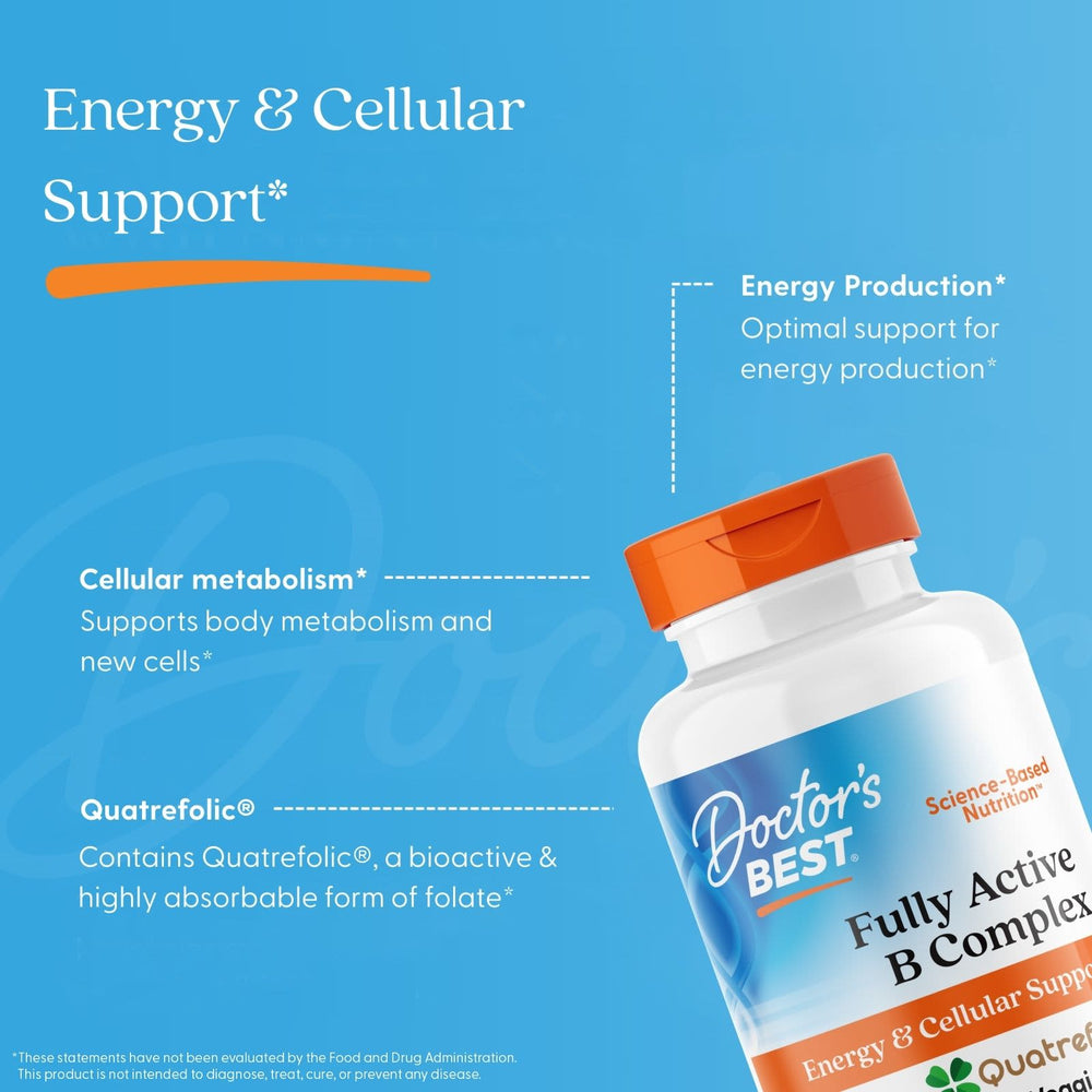 Doctor's Best Fully Active B Complex with Quatrefolic® er et videnskabeligt formuleret kosttilskud, der indeholder alle otte vigtige B-vitaminer i deres mest aktive og biologisk tilgængelige former. Denne veganske formel er specielt designet til optimal absorption og udnyttelse i kroppen, hvilket gør den til et fremragende valg for dem, der søger et komplet B-vitaminskompleks. Doctor's Best er kendt for sit fokus på videnskabsbaseret ernæring og højkvalitets ingredienser, og dette produkt er ingen undtagelse. Produktet er fri for GMO, gluten og soja, hvilket gør det passende for mange forskellige diætbehov og præferencer.